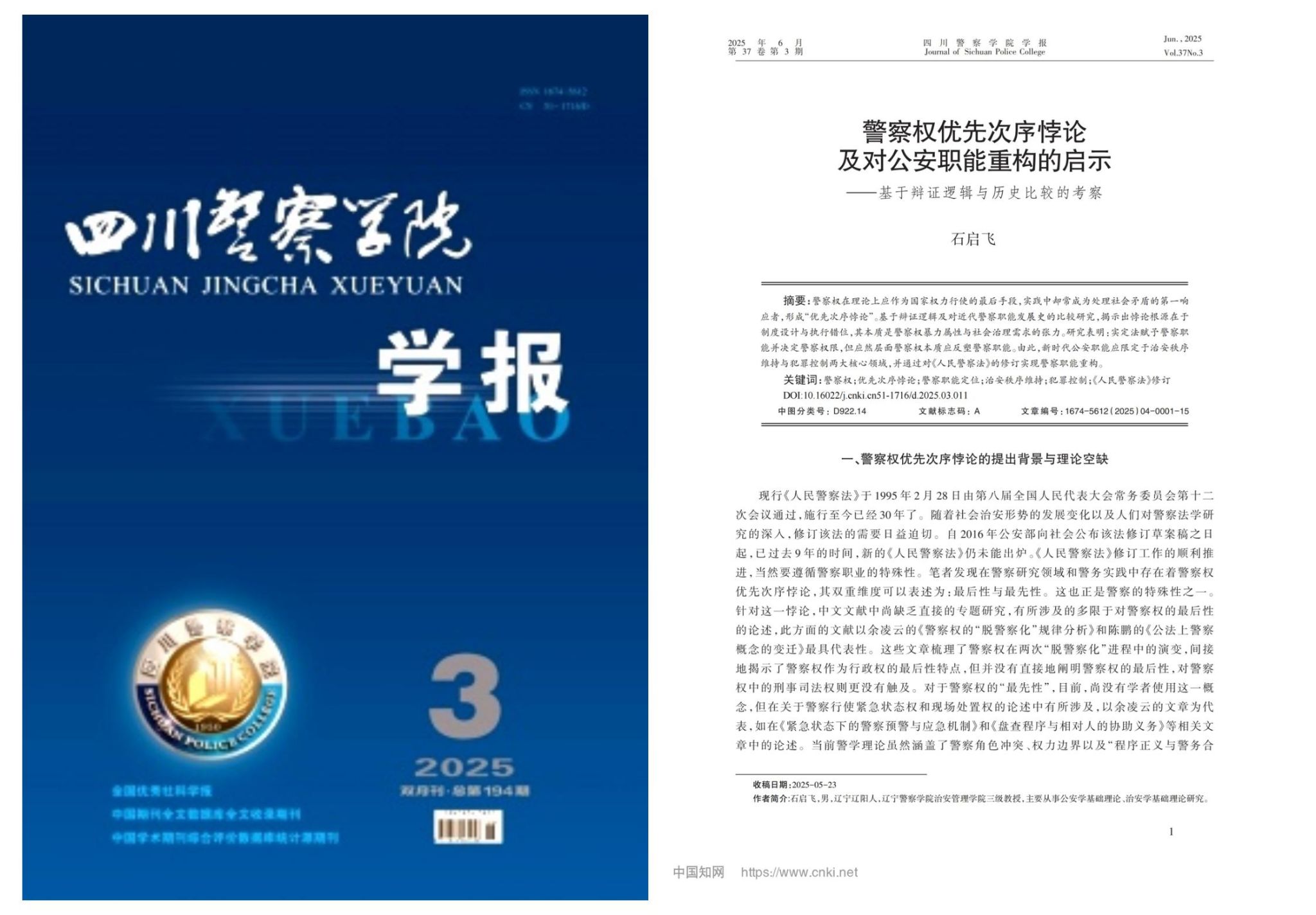 近日,中国人民大学书报资料中心《复印报刊资料·公安学》2025年第6期,全文收录《四川警察学院学报》(2025年第3期)文章《警察权优先次序悖论及对公安职能重构的启示——基于辩证逻辑与历史比较的考察》(作者:石启飞,辽宁警察学院治安管理学院三级教授;责任编辑:朱林兵)。