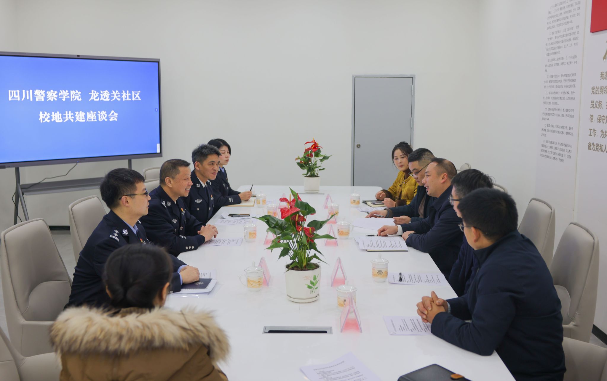 12月29日,学校与龙透关社区召开校地共建座谈会。四川警察学院党委常委、政治部主任袁洋,泸州市江阳区委社工部部长冯涛,区委组织部副部长何东桓,大山坪街道党工委书记汪祖贵、副书记王强,龙透关社区全体工作人员20余人参会,共商校地共建与基层治理发展大计。