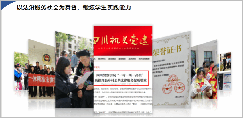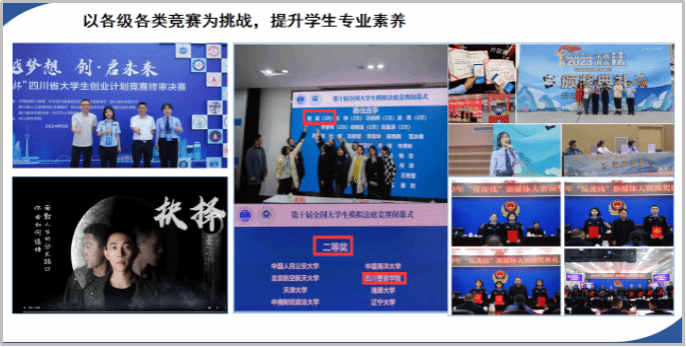 围绕学生关心关注的学业、就业、创新、帮困等重大现实关切,以学业就业为驱动,夯实学生专业基础;以参加各级各类竞赛为挑战,提升学生专业素养;以法治服务社会为舞台,锻炼学生实践创新能力。近年来,法学系四川生源地学生已实现一本线上招生,毕业生初次就业率稳步提升,就业岗位专业适配度、相关度较高。